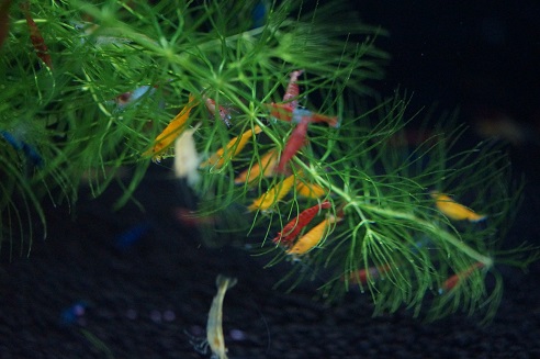 赤、青、黄などの色とりどりのチェリーシュリンプちゃん。