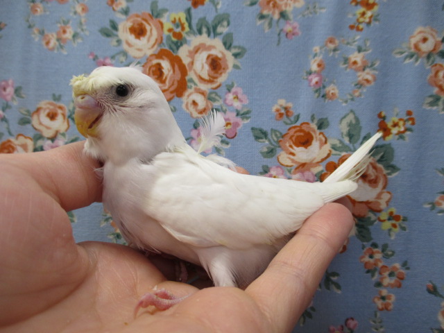 羽が巻くに巻けなかった感じのセキセイインコさん。