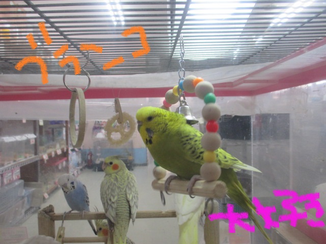 ジャンボセキセイインコのマダム(ブランコ大好き)やオカメインコさんたちと戯れております。