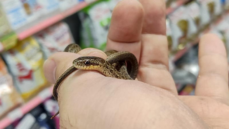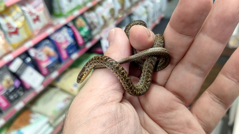 餌の食べ方がかわいらしく、死んだふりが得意で、見た目も特徴的なヘビさんです。